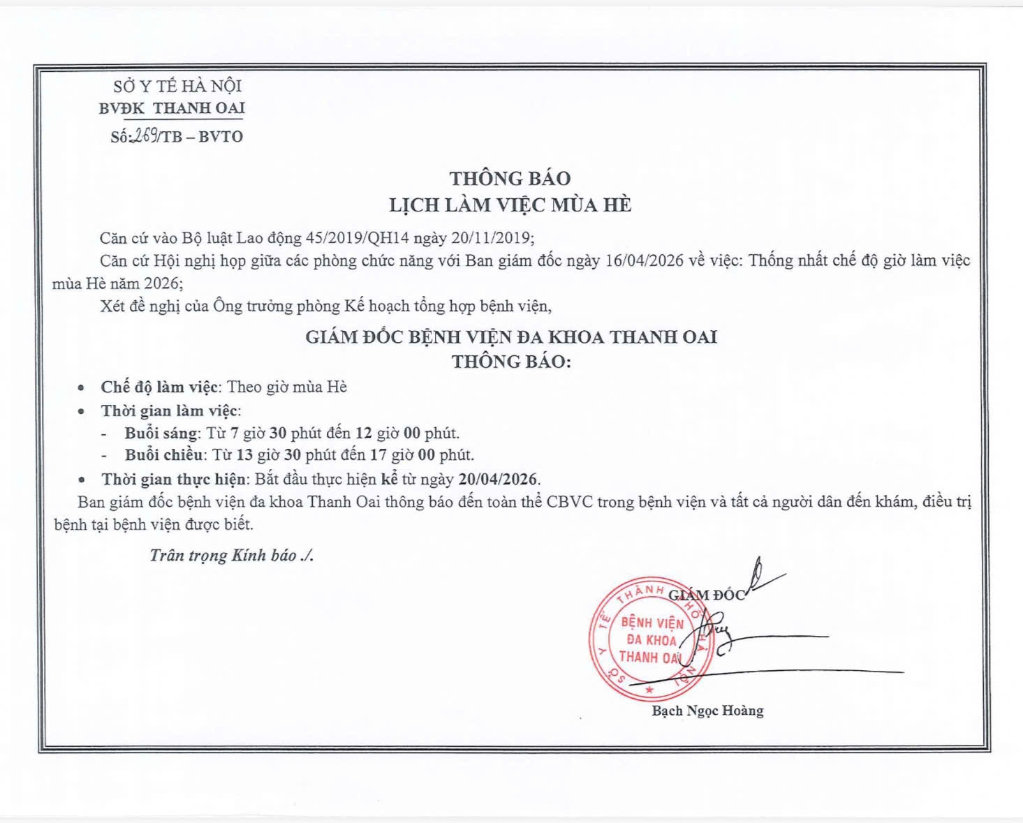 Trang chủ » Thông báo Lịch làm việc mùa hè BVĐK Thanh Oai